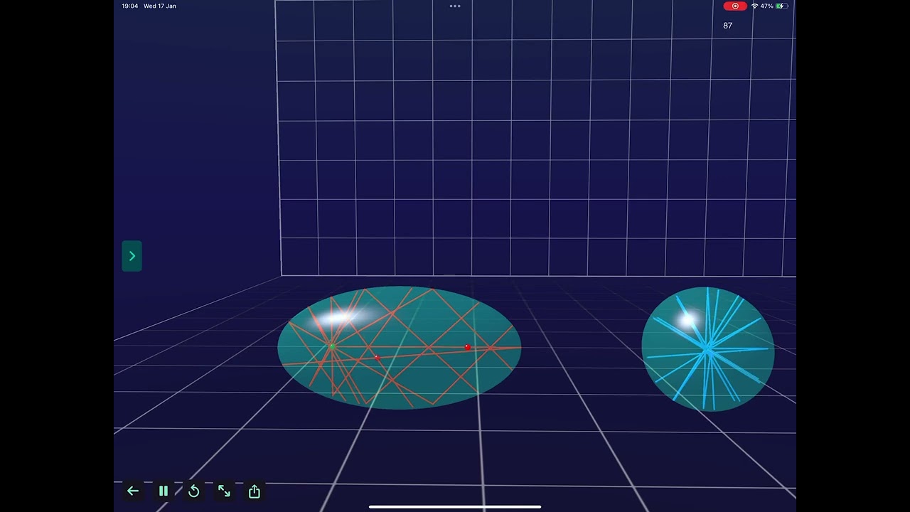 @LoopSpace arrived on webrepro. The ellipse reflections are still not what i expect, but maybe my expectations are wrong or i have bug! The video below shows reflection from the focus of the ellipse. I expected the reflected rays to meet at the other focus. The ellipse width is 2*height. I use ±sqrt(h2+w2) to calculate the offset from centre for the foci coords shown by the little spheres.